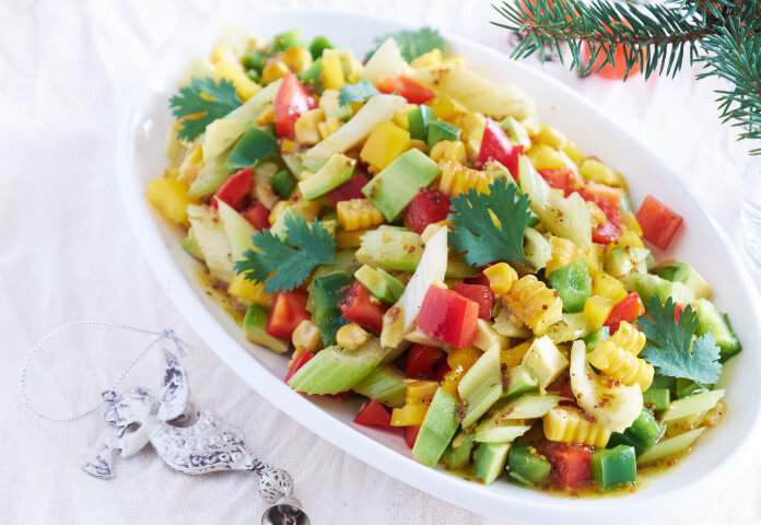 7. Возьмите острый нож и обрежьте кукурузные зерна. Смешайте кукурузу с перцем, авокадо и сельдереем. Полейте салат заправкой, посолите и поперчите по вкусу. Сверху украсите теплый салат с перцем кусочками кинзы.