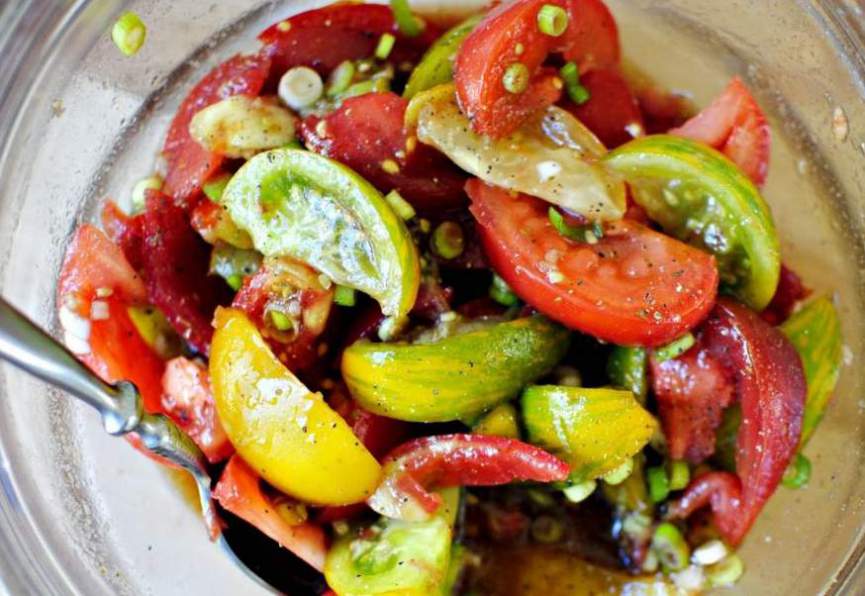 7. Помидоры, из которых ушел лишний сок, сложите в салатник, полейте заправкой с луком и чесноком, хорошо перемешайте. Лучше, чтобы салат настоялся в холодильнике минут 10-15, но можно подать к столу и сразу.