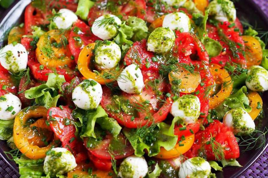 6. Салат из разноцветных помидоров с моцареллой и укропным соусом лучше подать на ужин. Это идеальная еда для жаркого вечера. Также его можно подать в дополнение к обеду, придав домашней трапезе яркие насыщенные нотки.