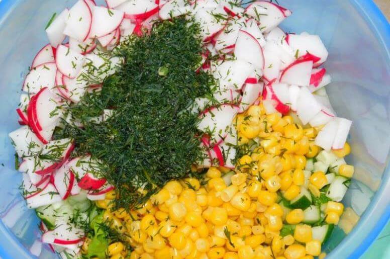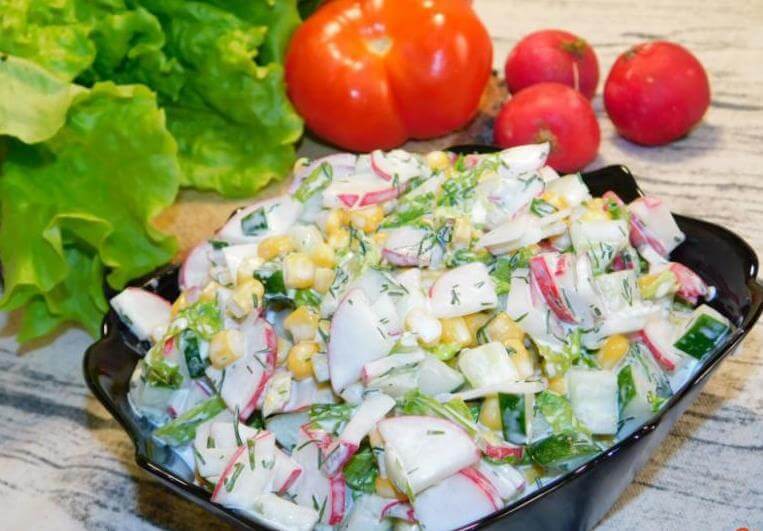 С наступлением первых дней весны, хозяйки охотно добавляют в салаты редис. Не так важно, выращенный он в открытом грунте или пока еще в теплице. Салаты с ним – сочные и аппетитные. Предлагаем вашему вниманию рецепт салата из редиса с огурцами и кукурузой для домашней трапезы и праздничного угощения.