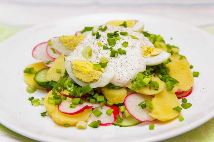 8. Сверху на нарезанные овощи выложите приготовленную густую заправку и четвертинки яиц. Салат из редиса с огурцом и картошкой готов. Подайте его как самостоятельную закуску или в дополнение к мясным блюдам.
