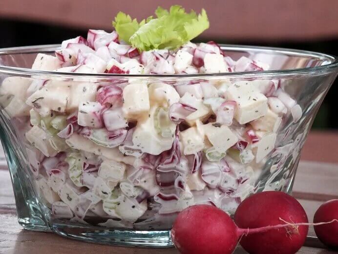 5.Салат из редиса с яблоком и сельдереем быстрый в приготовлении. Его можно подать к столу как второе блюдо или в качестве закуски. Он идеально подходит в дополнение к блюдам на гриле, например, со стейками. Несмотря на наличие в салате редиса, он имеет мягкий и нежный вкус, поэтому понравится детям.