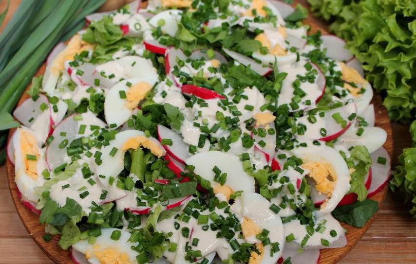 7. Весенний салат из редиса с зеленью и яйцами полейте заправкой, посыпьте рубленым зеленым луком и подайте к столу.