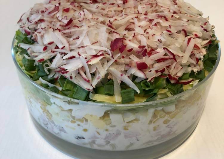 6.Возьмите прозрачный глубокий салатник и выложите в него подготовленные продукты слоями, слегка присаливая одни и поливая соусом иные, в следующей последовательности: