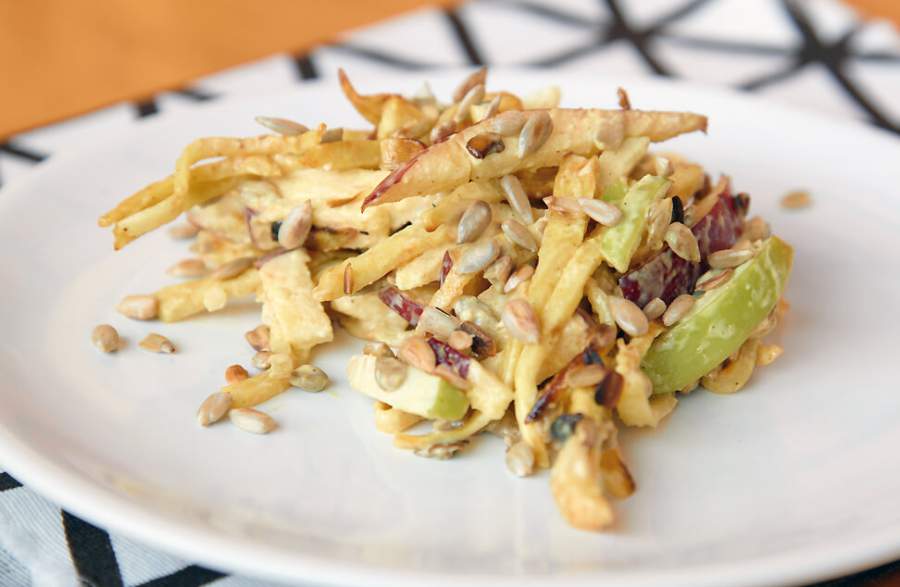 Салат из корневого сельдерея с карри приготовить не сложно, ингредиенты для него вполне доступные. Ведь корень сельдерея, яблоки, приправы и специи можно приобрести в магазине или на рынке круглый год. Яблоки желательно подобрать с контрастом вкуса и цвета. Подсолнечные семечки следует поджарить на сухой сковороде перед закладкой, чтобы придать салату более насыщенные нотки. Оливковое масло будет лучшим вариантом, но и подсолнечное рафинированное тоже подойдет.
