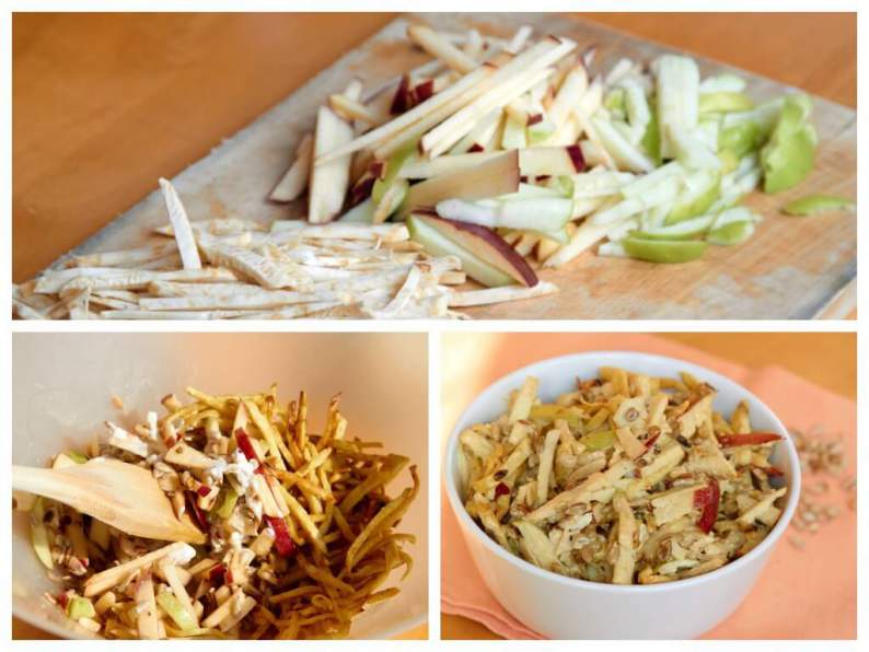 1.Подготовьте все необходимые ингредиенты. Сельдерей очистите от кожуры, яблоки чистить не нужно, удалите только сердцевину. Сельдерей и яблоки нарежьте тонкой соломкой. Можно использовать и один сорт яблок, но чтобы были ароматными.