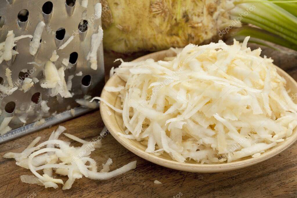 М'якуш кореня селери білий, але в подрібненому вигляді швидко темніє від контакту з повітряним середовищем. Тому не слід нехтувати приписом рецепту, відразу ж змішати подрібнений овоч з лимонним соком, який запобігає потемнінню, зберігаючи природний колір та смак. Лимонний сік можна замінити винним оцтом.