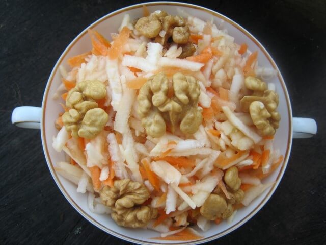 У народі збереглася приказка: хочеш бути здоровішим – їж селеру. Цей овоч (прикореневий плід) має багато вітамінів і інших корисних речовин, тому його врожаї повинні використовуватися в домашньому меню. Пропонуємо вам цікавий рецепт солодкого салату з кореневої селери з яблуком, морквою та горіхами.