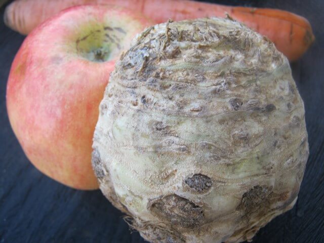 1.Підготуйте всі необхідні інгредієнти. Корінь селери, морква та яблуко вимийте та очистіть від шкірки.