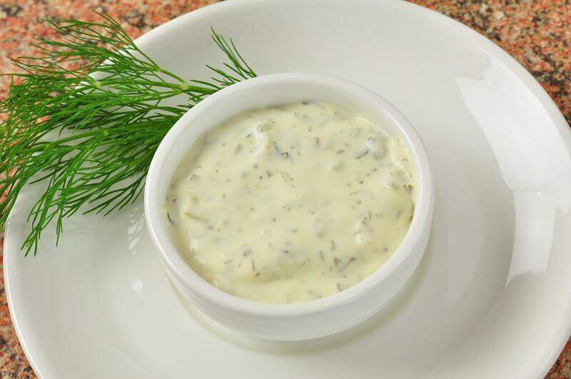 2. Зелень укропа мелко нашинкуйте и добавьте к сметанно-майонезной смеси. Посолите, поперчите и перемешайте соус. Переложите его в соусник и поставьте в холодильник настаиваться, пока будете готовить салат.