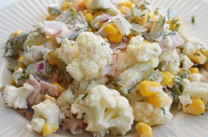 4 .В глубокой миске соедините подготовленные соцветия цветной капусты с нарезанными овощами и яблоком. Добавьте кукурузу, рубленую зелень укропа и перемешайте.