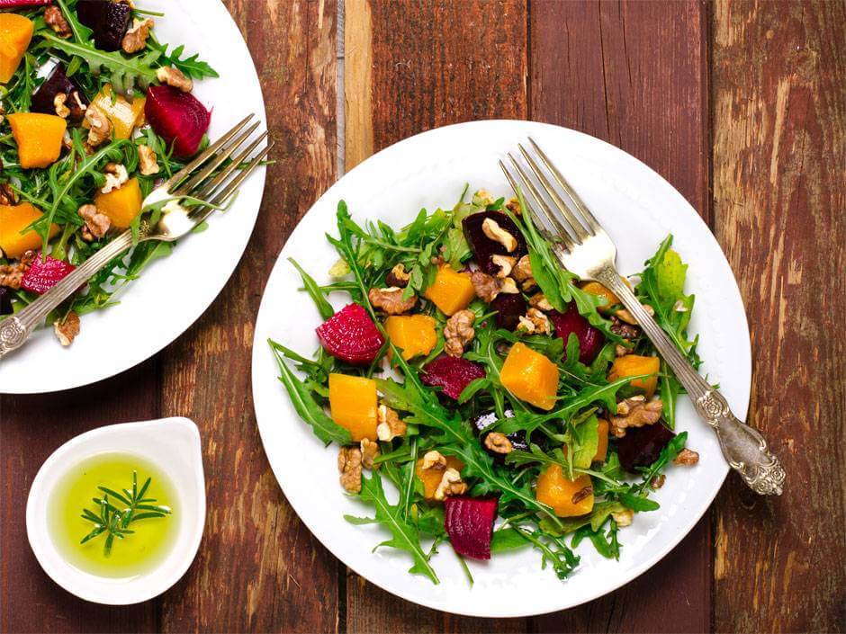 7.Рукколу вымойте и обсушите. Разложите запеченные кубики тыквы и свёклы на порционные тарелки вперемешку с листьями рукколы.