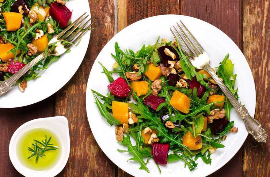 7. Рукколу вымойте и обсушите. Разложите запеченные кубики тыквы и свёклы на порционные тарелки вперемешку с листьями рукколы.