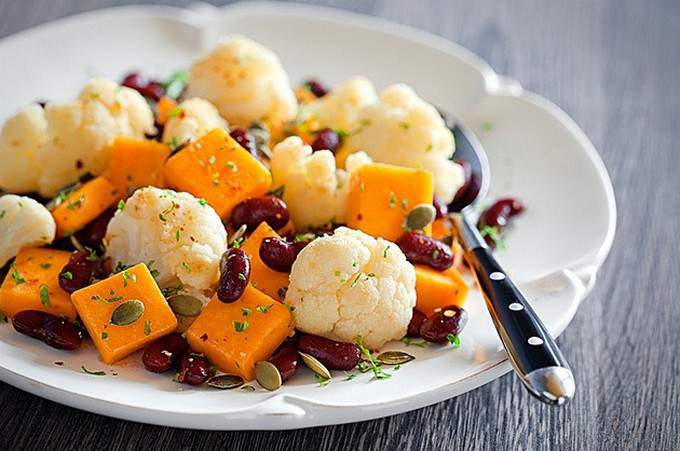 6. Смешайте в салатнике кусочки тыквы с цветной капустой, консервированной фасолью, измельченным чесноком и зеленью, посолив и поперчив по вкусу.