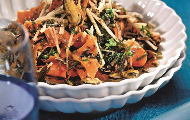 6. Смешайте в миске маринованную морковь с морской капустой, нарезанными кореньями, мидиями и сыром.