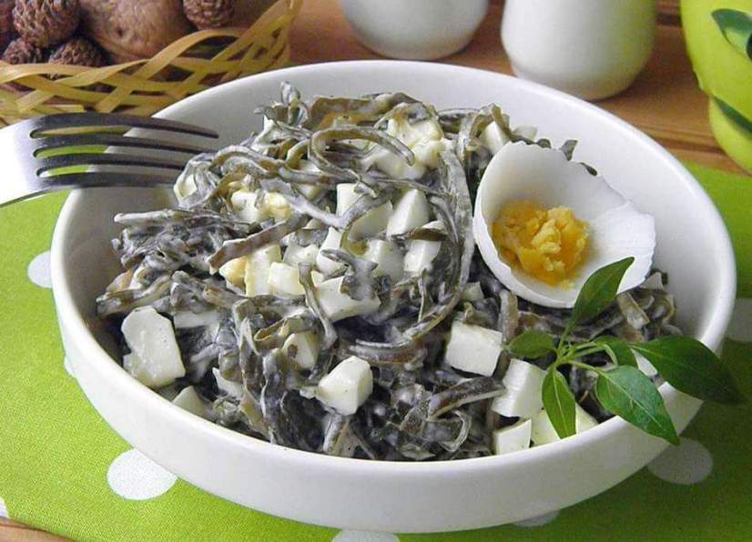 8. Готовый салат из морской капусты с яйцом переложите из миски в салатник, украсьте по своему усмотрению и подайте к столу.