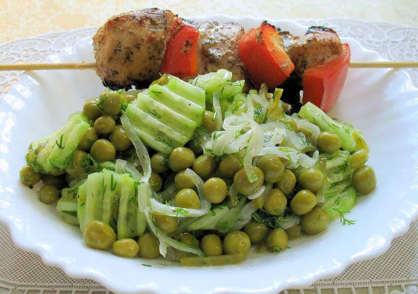 7. Подайте аппетитный салат из зеленого горошка к шашлыку или к другим мясным блюдам.