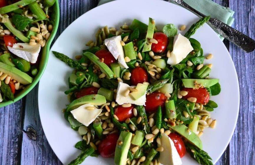 8.Готовый салат из спаржи и авокадо залейте соусом, посыпьте обжаренными орешками и подавайте к столу. Блюдо идеально подходит на обед, для работы или пикника.