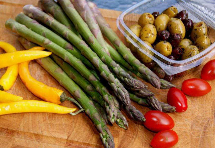 3. Спаржу и перец приготовьте на пару в пароварке около 25 минут, чтобы стали мягкими. Затем слегка поджарьте на сковороде с оливковым маслом.