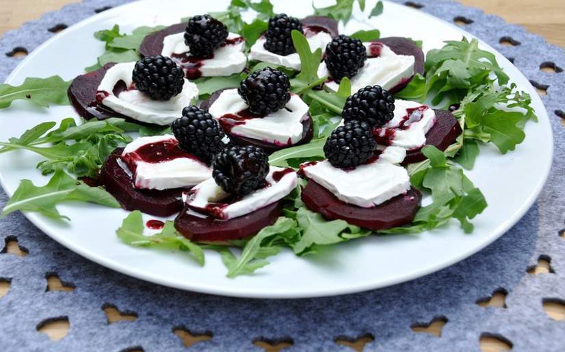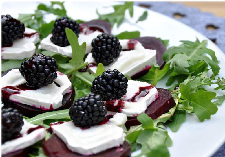 7. На блюдо насыпьте рукколу, выложите на нее нарезанную свёклу. На каждый кусочек свёклы положите пластинку сыра, а на сыр – ягоды ежевики. Полейте сверху кисло-сладким соусом и посыпьте солью и перцем крупного помола.