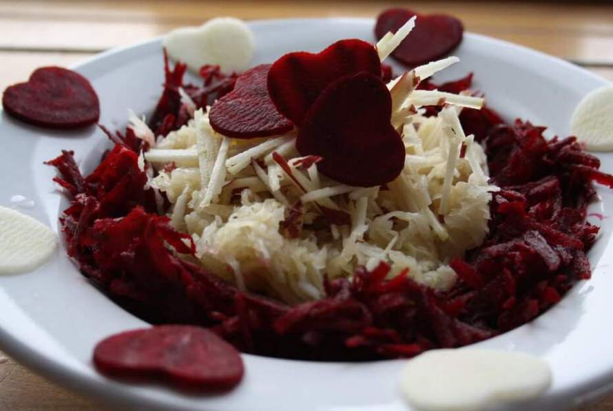 7. На плоскую тарелку выложите тертый сельдерей горкой. Вокруг него в качестве окантовки выложите тертую свёклу. В качестве украшения разложите белые и бордовые сердечки на бордюре тарелки и сверху на тертые овощи. Полейте салат заправкой.