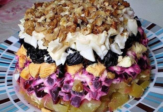 - четвертый слой – запаренный и нарезанный мелкими кусочками чернослив;