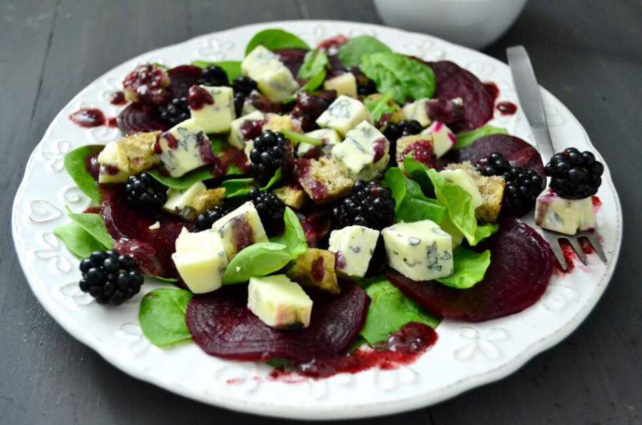 6. Салат из печеной свёклы с плесневым сыром и ежевикой готов. Подавайте к столу и наслаждайтесь.