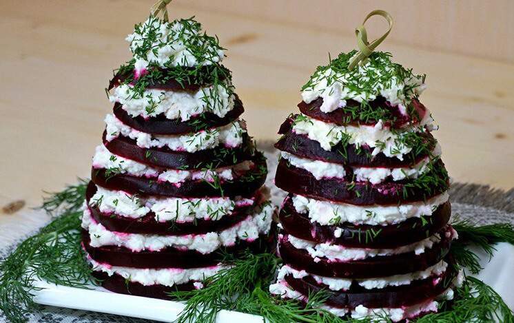 6. На последний, самый маленький кружок свёклы выложите остатки сырной массы горкой, имитируя заснеженную верхушку ели. Конструкция получается устойчивой, но лучше все же закрепить ее шпажкой для сервировки.