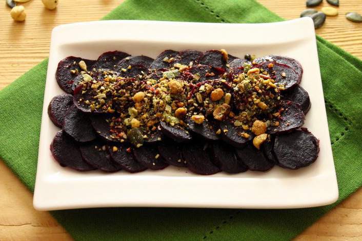 9. Остывшую свёклу очистите, нарежьте тонкими ломтиками и разложите на большом блюде или на четырех порционных тарелках. Заправьте свёклу соусом и посыпьте приправой из семян и орехов.