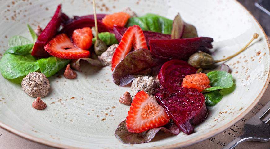 8. Выложите соус на свеклу таким способом, чтобы дольки грейпфрута лежали на свекле и украсьте сверху салат свежей клубникой. Подавайте салат охлажденным.