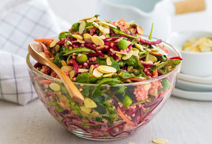 7. Смешайте в большом салатнике свеклу, морковь, авокадо, пшено и горошек. Добавьте руколу и полейте сверху салат заправкой, затем перемешайте.