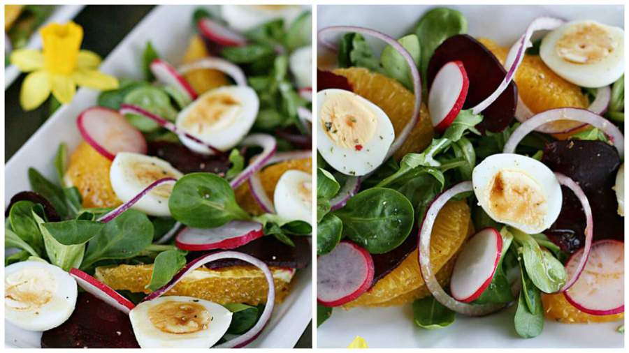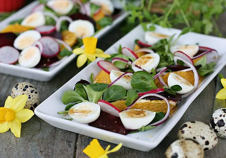 Весенний салат из свёклы с апельсином и перепелиными яйцами