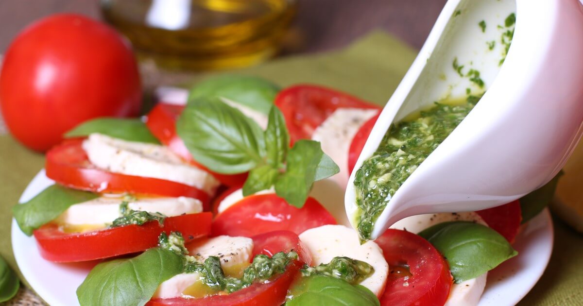 Салат Капрезе с соусом песто славится во всем мире. Сочные красные помидоры в его составе отлично сочетаются с мягким сыром моцарелла и соусом песто. Подавать желательно на белых тарелках.