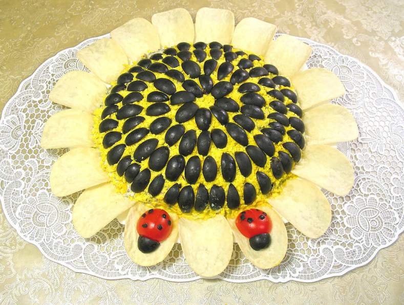 5.Натрите яичные желтки на мелкой терке и обсыпьте ими холмик салата. Черные оливки достаньте из банки, нарежьте на четвертинки и воткните в желтый холмик, изображая семечки подсолнуха. По периметру воткните чипсы в качестве лепестков.