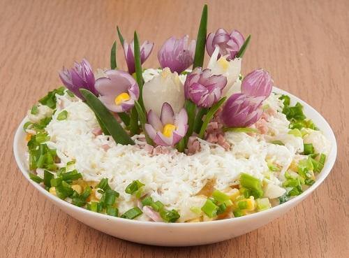 Предлагаем вашему вниманию интересный рецепт нарядного салата с ветчиной и курагой «Поляна подснежников», который будет украшением праздничного стола. Аппетитное сочетание ветчины с сухофруктами и кукурузой придаст блюду замечательный вкус, а букетик луковичных цветов подарит весеннее настроение.
