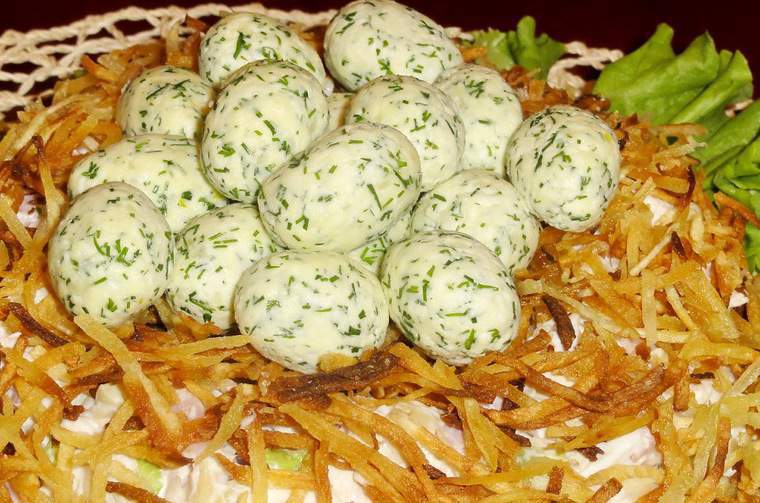 8. Салат «Гнездо глухаря» готов к подаче на стол.