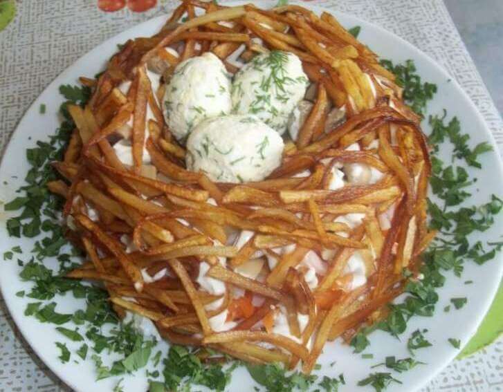 Готовим салат «Гнездо глухаря» с ветчиной и чипсами