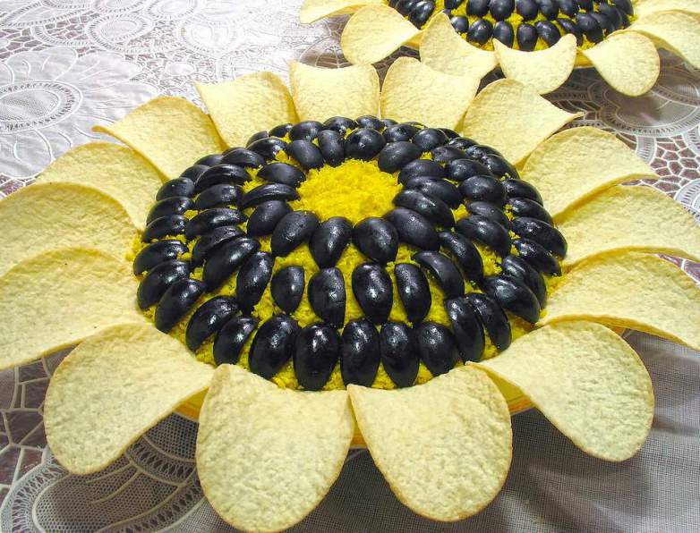 11.Последним штрихом будут «лепестки подсолнуха» – вставленные в салпт по кругу чипсы. Салат "Подсолнух" можно сразу подавать к столу.