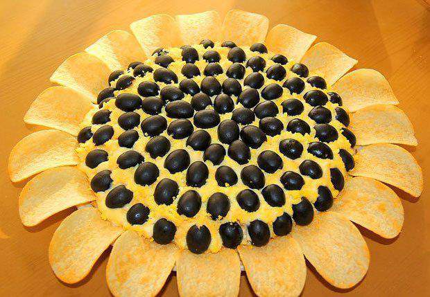 8. Салат «Подсолнух» с рыбными консервами поставьте на 1-2 часа в холодильник, а перед подачей на стол декорируйте лепестками чипсов, воткнув их по кругу в салат.