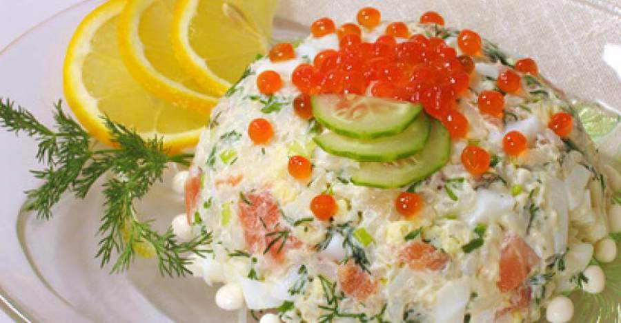 Готовим салат «Мимоза» с соленым лососем и икрой