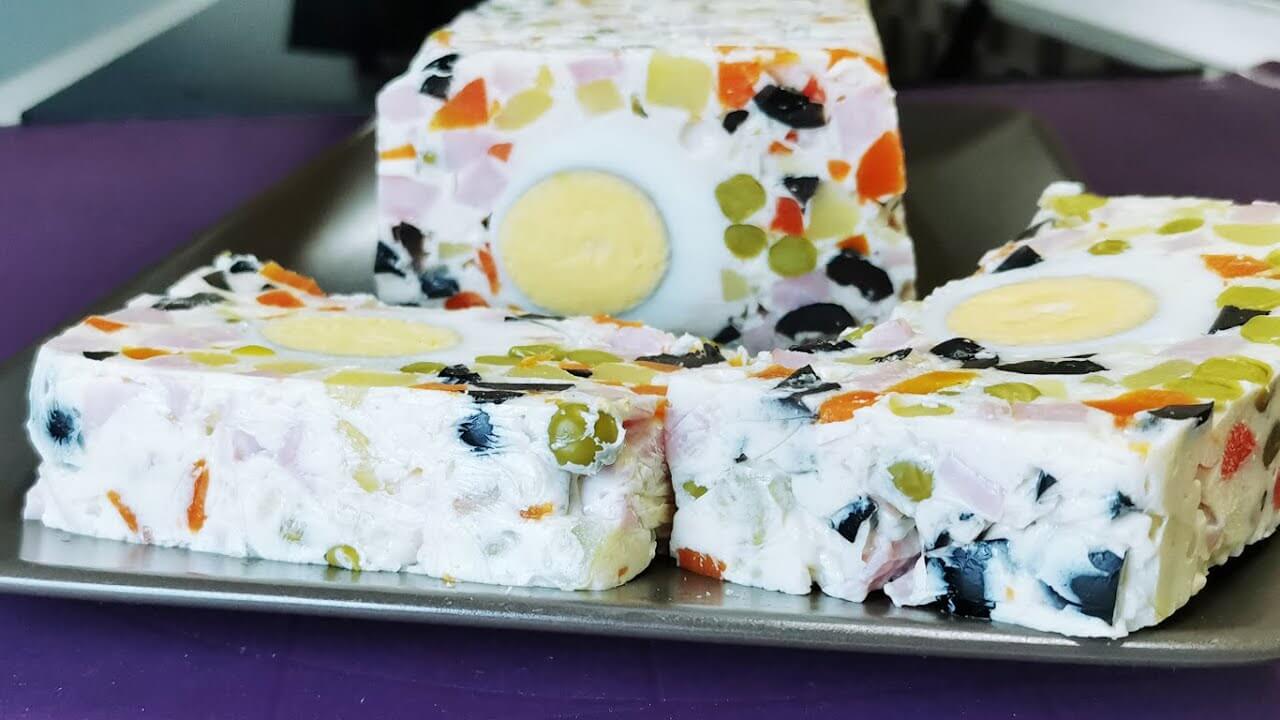 Необычный и оригинальный мраморный «Оливье» к празднику готовится из традиционных для этого салата продуктов, но есть некоторые дополнения в списке ингредиентов и в процессе приготовления. В списке ингредиентов при желании предлагается заменить соленые (маринованные) огурцы оливками. Но вместо привычного майонеза введена заправка на его основе с добавлением сметаны, горчицы, жидкости из банки с зеленым горошком и желатина. Именно благодаря желатину салат превращается в застывшую желейную текстуру, как бы «мраморную» на срезе.