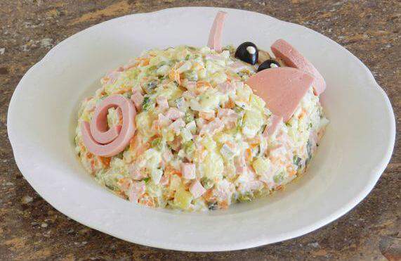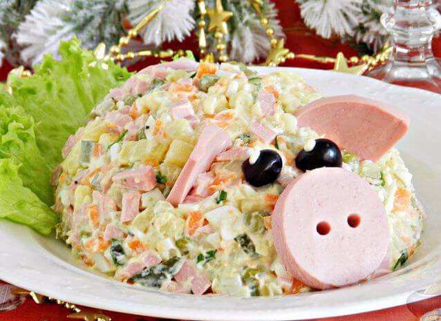 К наступающему Году Свиньи хозяйки стремятся придать праздничному застолью тематические нотки блюд. Даже привычный «Оливье», приобретая соответствующую форму, превратит праздник в сказочное действо. Предлагаем вашему вниманию рецепт вкусного и забавного новогоднего салата «Оливье» в виде поросенка.