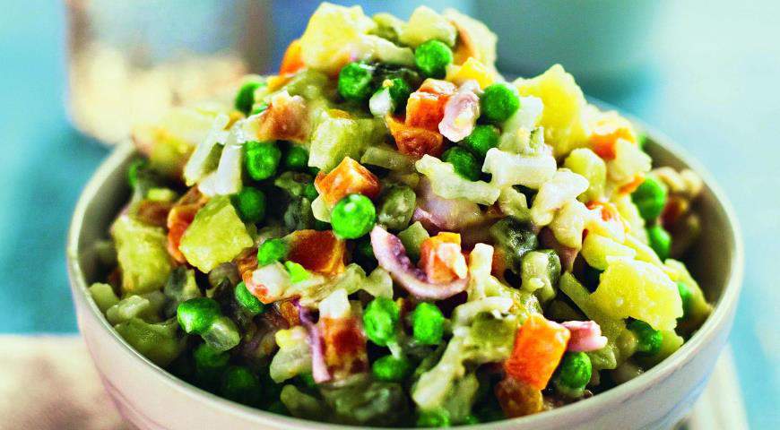6. Высыпьте все ингредиенты в одну глубокую миску, заправьте постным майонезом и хорошо перемешайте. Оставьте салат на час в холодильнике, пусть пропитается. Постный салат оливье готов.