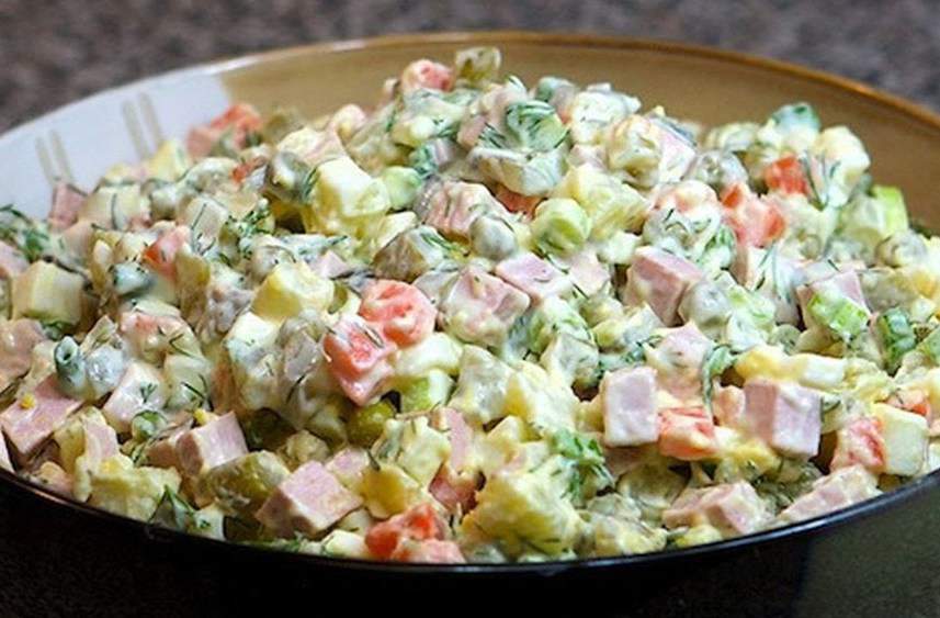 Современный салат Оливье придуман во времена советской суровой действительности, когда с рябчиками и икрой было туговато. С тех пор и началась история нового салата Оливье с колбасой вместо рябчиков, зеленого горошка вместо сои кабуль и майонезом вместо прованского оливкового масла. Мы готовим его в будни и по праздникам.