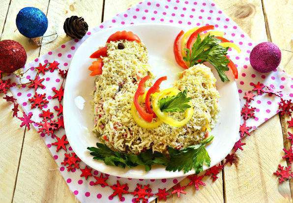 11. Салат оливье в виде петуха, символа 2017 года, готов. Пора подавать его на праздничный новогодний стол. Гости ахнут от восторга.