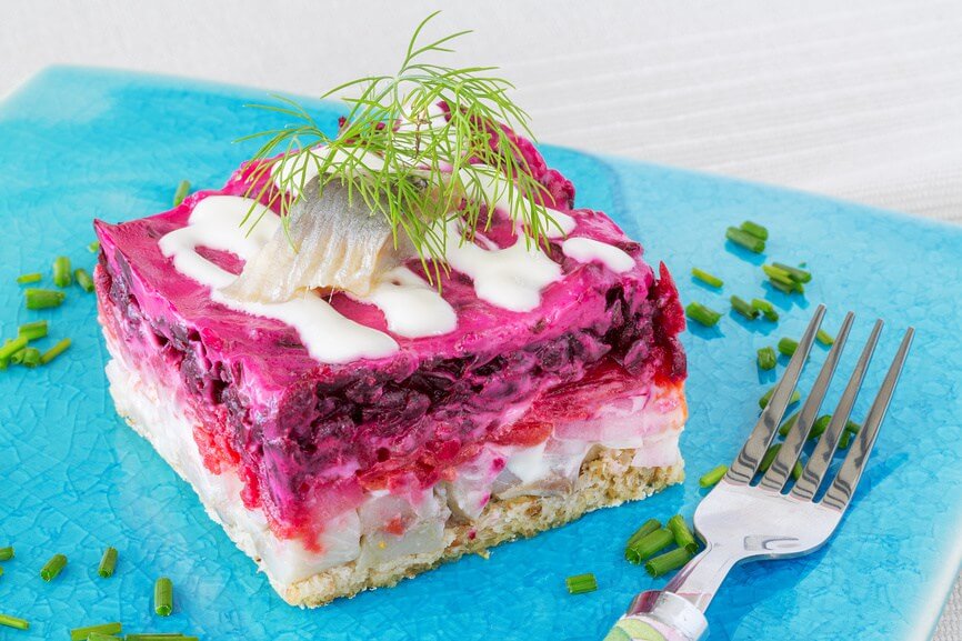 •Салат приобретет оригинальный вкус, если вы замените соленую сельдь копченой рыбой или красной икрой, не меняя процесса и последовательности выкладывания слоев.
