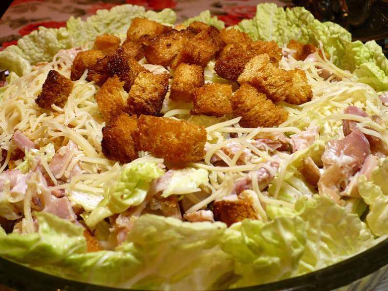 7. Полейте салат заправкой перед подачей на стол. Посыпьте сверху тертый пармезан и сухарики. Раньше этого делать нельзя, так как сухарики могут потерять свою хрусткость.