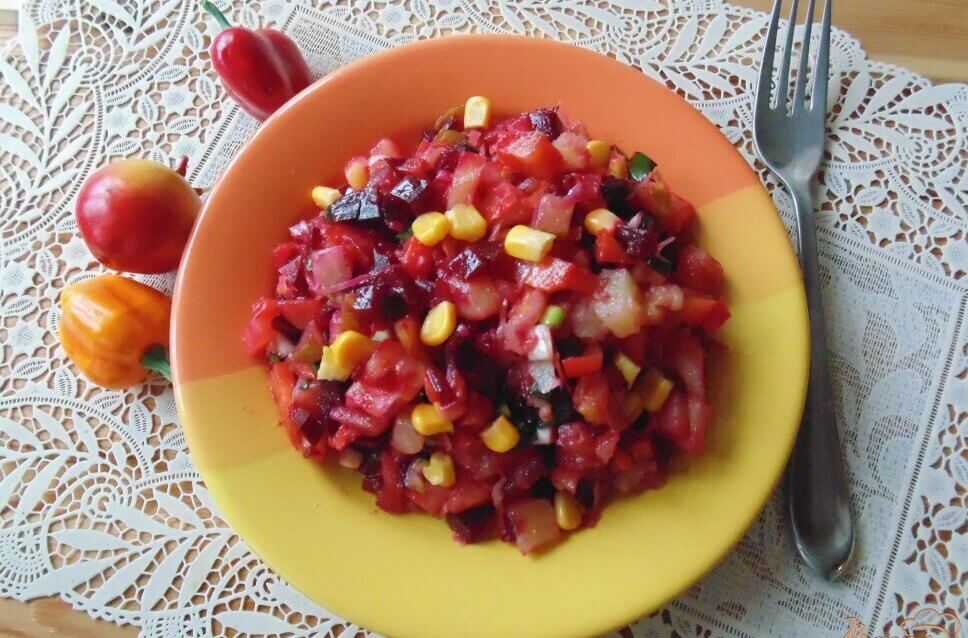 Популярность салата с народным названием «винегрет» не убывает, приобретая новые варианты. Кроме основного набора овощей, в нем часто используется «зерновой» ингредиент – зеленый горошек или фасоль. Предлагаем рецепт винегрета с консервированной кукурузой, придающей ему сладкий пикантный оттенок.