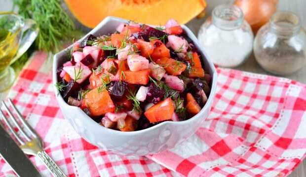 Если вы любите популярный овощной салат с привычным названием «винегрет», то с интересом ознакомитесь с его оригинальной вариацией. Предлагаем вашему вниманию рецепт винегрета с маринованной тыквой и яблоками, заготовить которую вы сможете впрок в домашних условиях по любому из множества рецептов.
