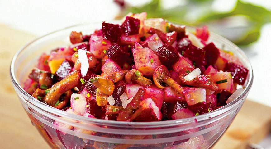 В классический винегрет кроме вареной свеклы, картофеля и моркови входит зеленый горошек или фасоль и соленые огурцы или квашеная капуста. Часто хозяйки в винегрет добавляют маринованные грибы. Предлагаем вашему вниманию рецепт очень вкусного и многими любимого винегрета с маринованными опятами.